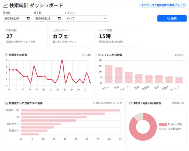 管理画面では検索動向が可視化されるため、データに基づいた効果的な観光集客や店舗運営への活用が可能です。
